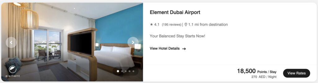 During my stay at the Element Dubai Airport hotel, the night cost 18,500 Marriott Bonvoy points or around CAD 90. I chose to pay for my night with my Marriott Bonvoy® American Express®* Card to earn 5 points per dollar.