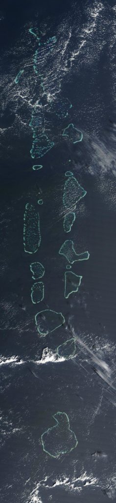 The Maldives is made up of 26 atolls, comprising almost 1,200 coral islands, located in the Indian Ocean, about 700 km off the coast of Sri Lanka. Here is a satellite photo of the islands, placed horizontally on the cartographic site: