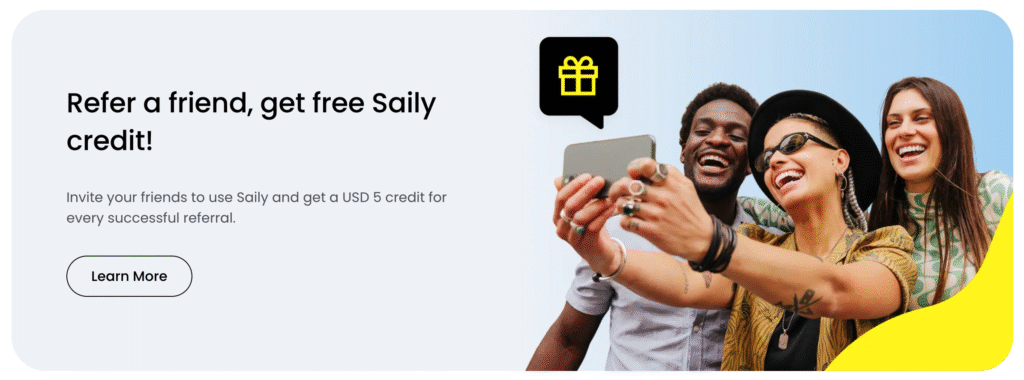 Every friend that you refer will get $5 USD off their first purchase, and once they’ve made that purchase, you get a $5 USD Saily Credit that’s good for your next eSIM.