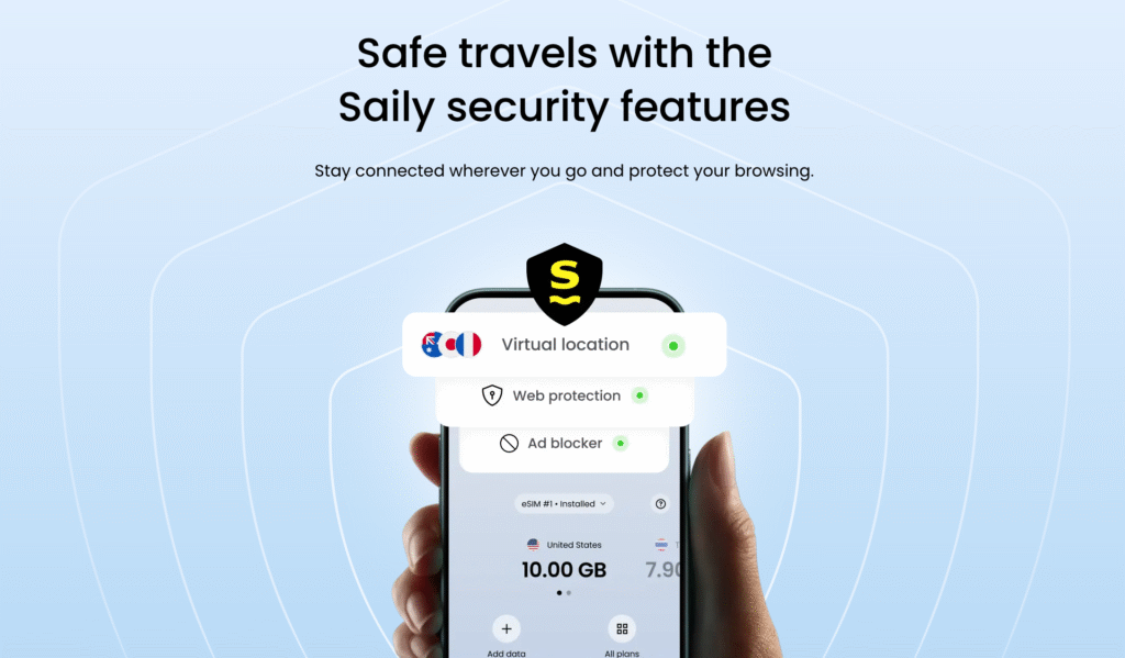 One of the benefits of choosing a Saily eSIM is that you will enjoy security features like ad-blocker, virtual location selection, and web protection.