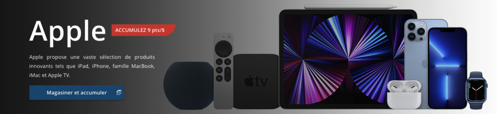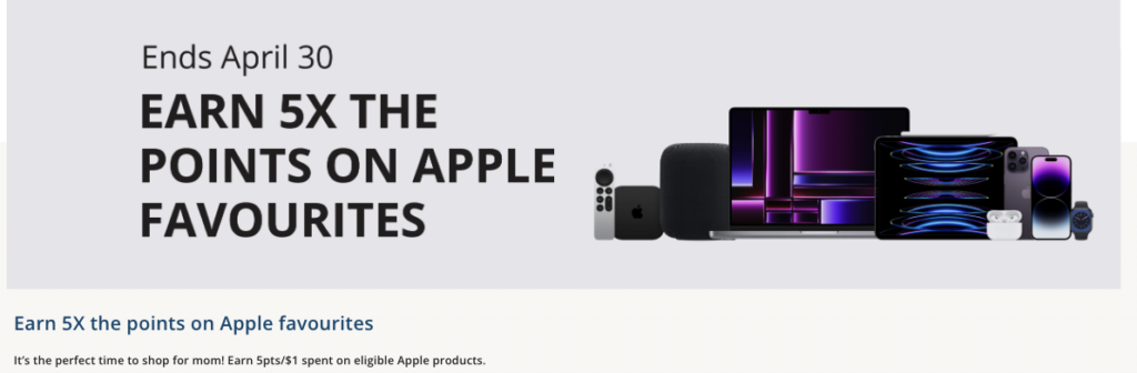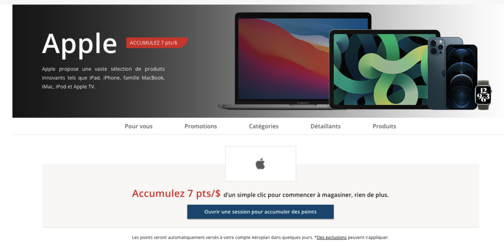 For example, if you buy a $1,000 Apple product, you’ll earn 5,000 Aeroplan points (1,000 x 5).