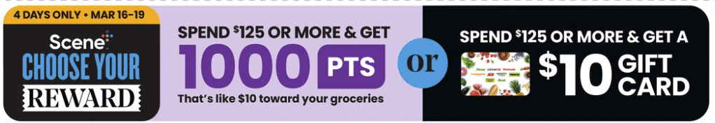 $100 in purchases will give you 1,000 bonus points ($10 value or 10% cash back). Or, 400 Scene+ points are given with a minimum purchase of $50 ($4 or 8% value).