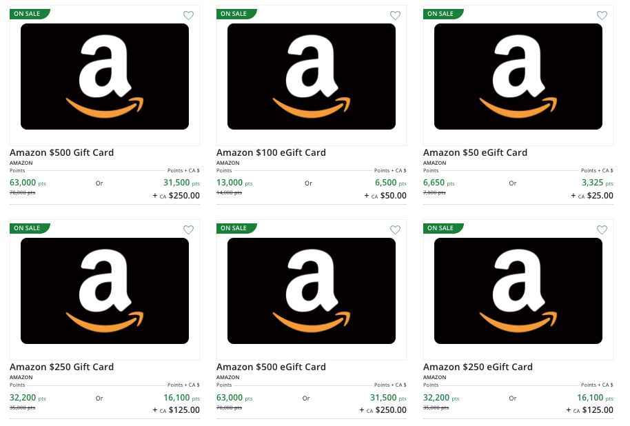 It can also be interesting to buy your Amazon gift cards at grocery stores (IGA, Sobeys, Metro, Super C) with one of these two cards: the National Bank World Elite Mastercard and the Scotiabank Gold American Express Card. Indeed, you will get 5 points per dollar on this Amazon gift card purchase, which is equivalent to 5%. And if you use your Scotiabank Gold American Express Card at IGA/Sobeys grocery stores, you’ll even get 6 points per dollar!