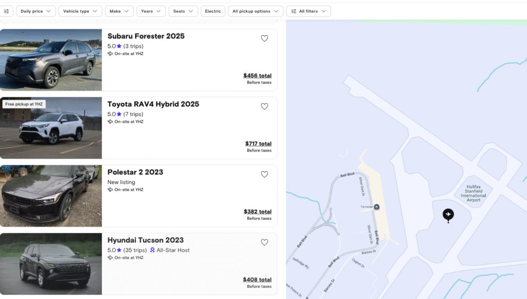 For example, this Polestar 2 car in Halifax with Turo would cost you $332 (before taxes), instead of $382.
