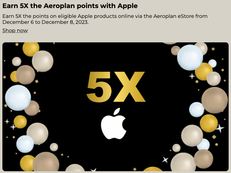 For example, if you buy a $1,000 Apple product, you’ll earn 5,000 Aeroplan points (1,000 x 5).