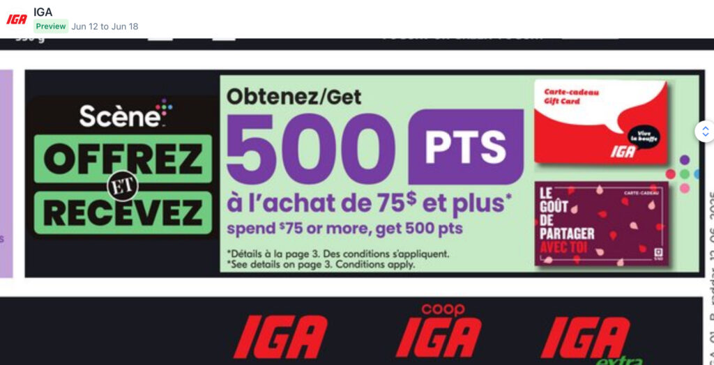 Read all the terms and conditions associated with the offers on the Scene+/IGA website or mobile app. Some offers require prior activation or a coupon.