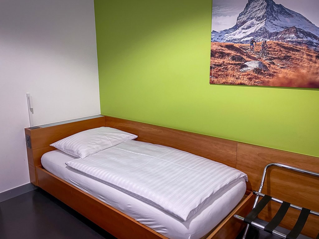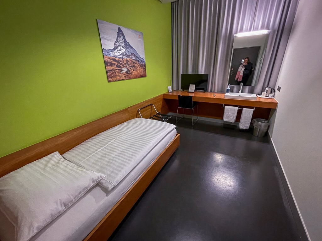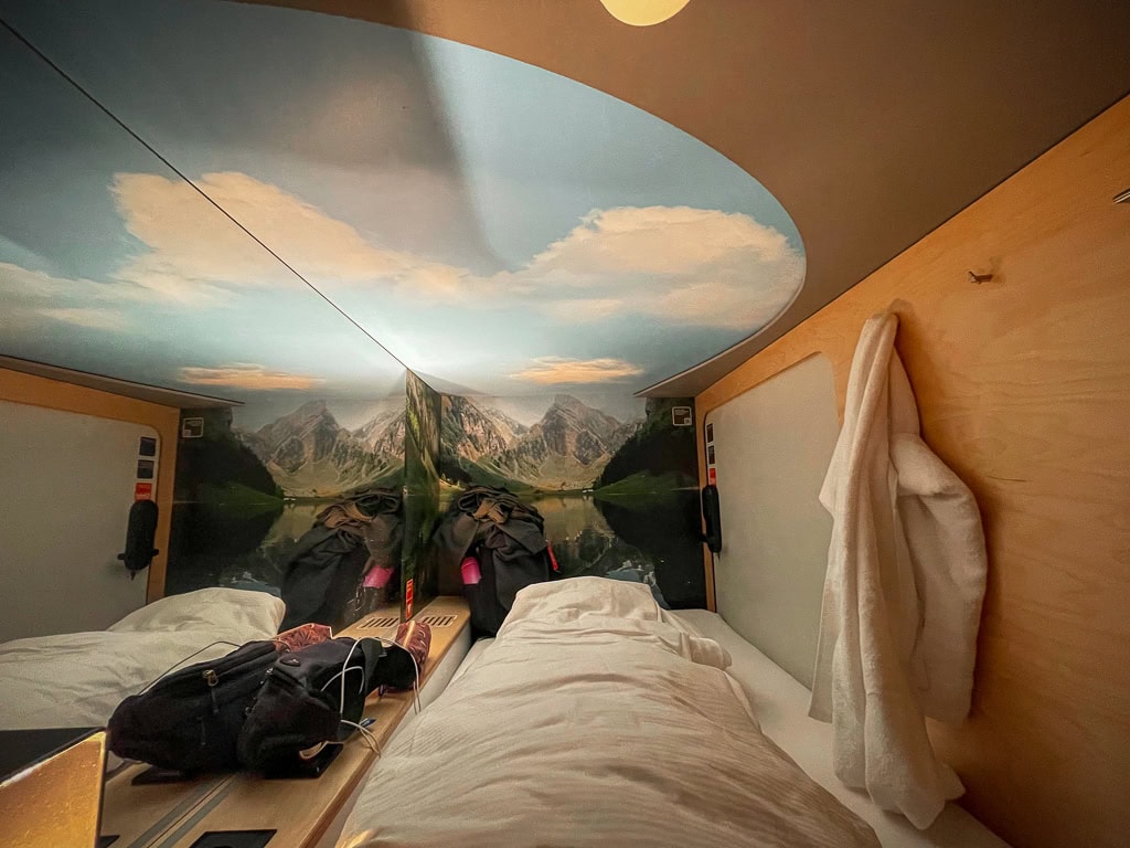 Le prix varie selon le choix du lit d’en haut ou en bas et débute à 63 CHF pour une nuit, ce qui inclut aussi un accès wifi. On retrouve aussi sur place des chambres accessibles seulement aux femmes (plus chères, malheureusement) et des capsules pour personnes en situation de handicap. L’enregistrement se fait électroniquement à une borne à l’entrée grâce à un code reçu par WhatsApp ou courriel.