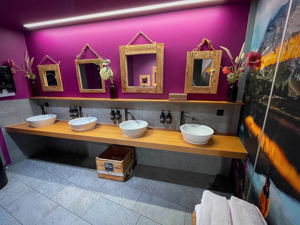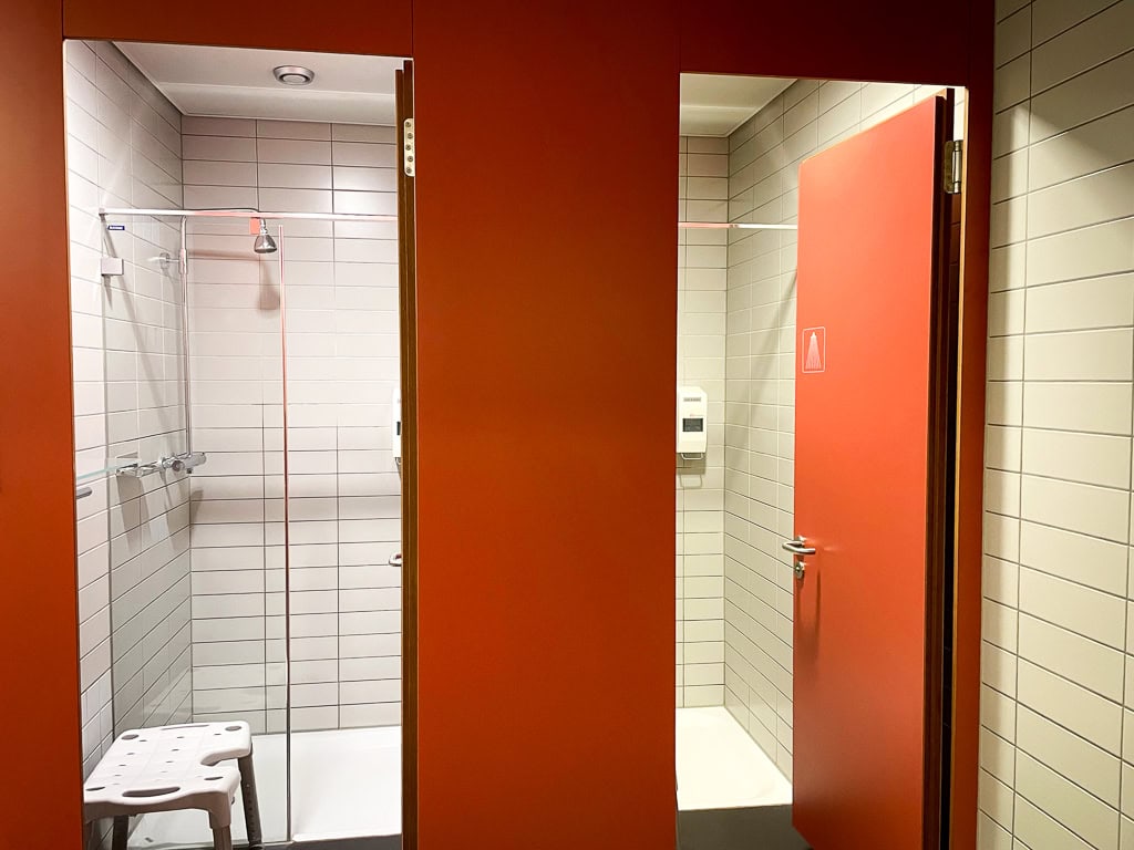 Inclus dans le prix; un accès à une salle de bain où douches, toilettes, serviettes, produits nettoyants et séchoirs sont offerts.