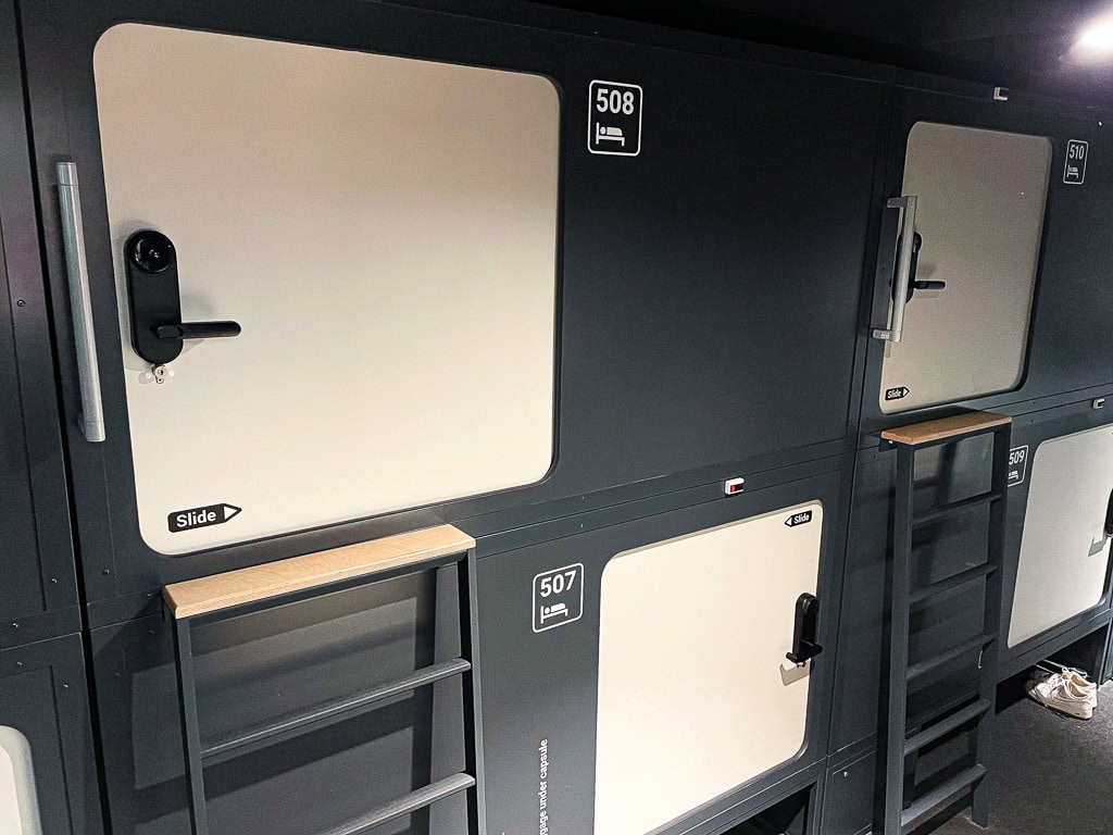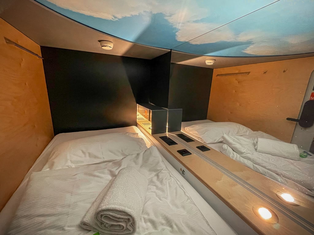 Pour mon retour, je suis sortie de l’aéroport, à quelques pas seulement de l’entrée, pour tester le Capsule Hotel – Alpine Garden. Tout aussi facile à trouver que le précédent grâce à la signalisation claire, on y retrouve des chambres dans lesquelles il y a plusieurs lits superposés complètement fermés comme des capsules.