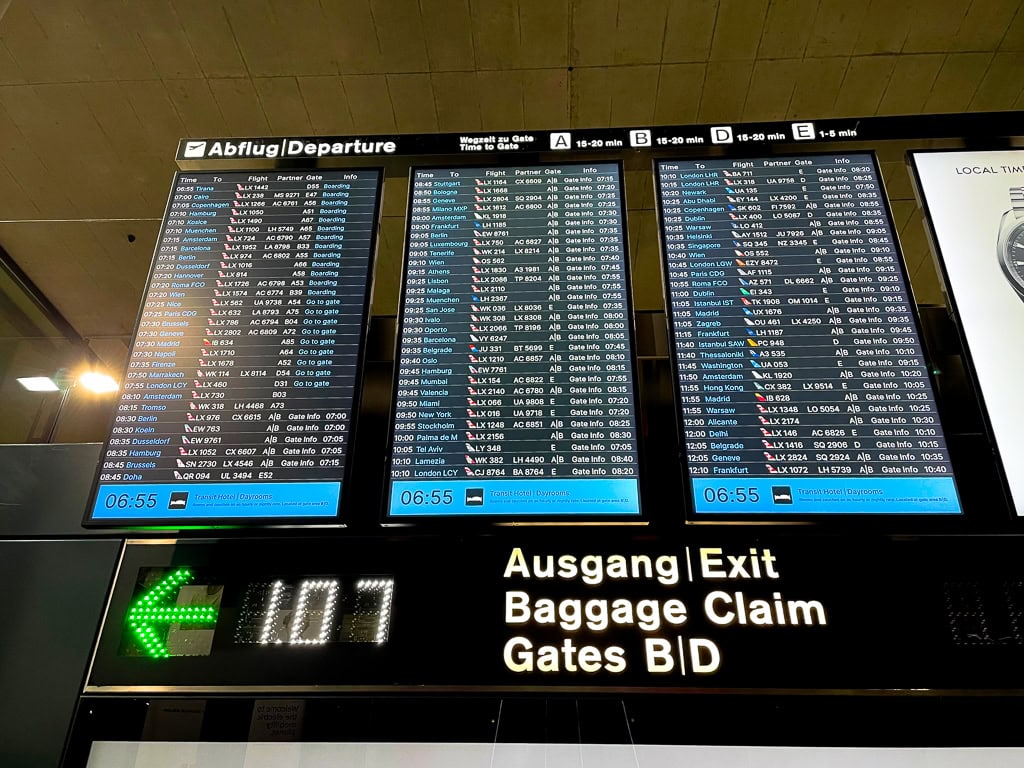 L’aéroport de Zurich est divisé en quatre terminaux : A-B-D-E. La plupart des restaurants et boutiques se trouvent au centre entre le terminal A et le B-D avant de traverser la sécurité. Le terminal E est accessible par un tramway électrique qui part toutes les 5 à 10 minutes. Le trajet dure quelques minutes seulement.