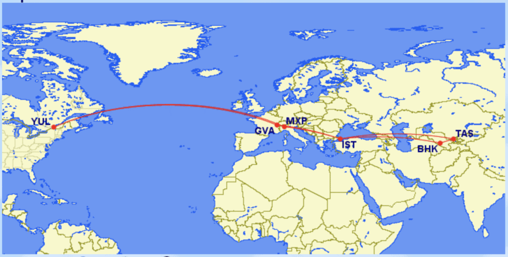 Notre itinéraire était le suivant : Montréal — Lausanne (via Genève) — Istanbul — Tachkent — Samarkand — Boukhara — Istanbul — Milan — Montréal