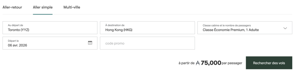 Dans ce cas, si vous transfériez 75 000 points Avion vers Asia Miles, vous pourriez ensuite les échanger contre un vol aller simple en classe économique premium de Toronto à Hong Kong sur Cathay Pacific.