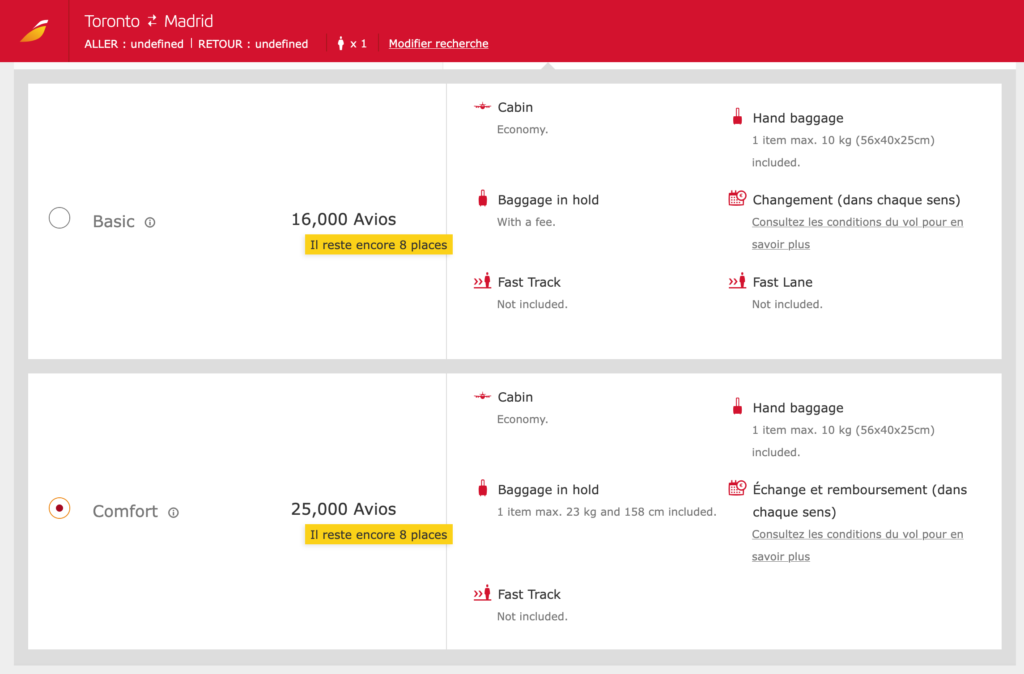 En fait, vous pourriez même obtenir un vol aller-retour au tarif « Basic » d’Iberia de Toronto à Madrid pour les 35 000 points Avion que vous obtenez simplement en vous inscrivant à l’une des cartes de crédit de marque Avion ci-dessus!