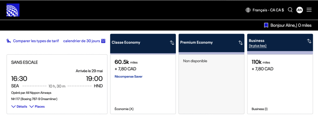 5. Réservation avec Aéroplan : Une fois un vol repéré, même s’il n’apparaît que via MileagePlus ; essayez de le retrouver sur le site d’Air Canada.