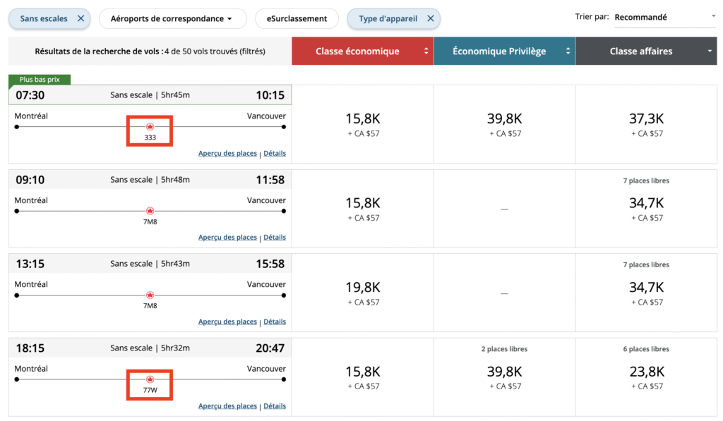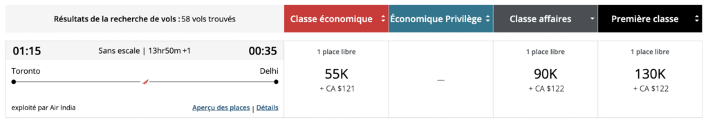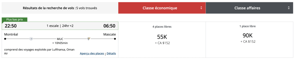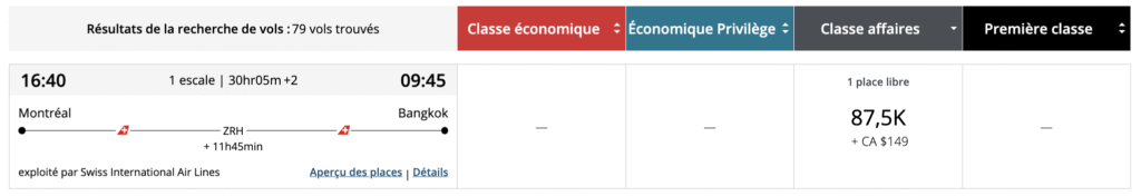 Toutefois, les prix peuvent être raisonnable sur les longues distances comme Montréal – Vancouver, lorsqu’on compare avec le prix en argent. En pratique, il est plus réaliste de trouver ce type de trajet à partir de 25 000 points, ce qui reste très avantageux pour traverser le pays confortablement.