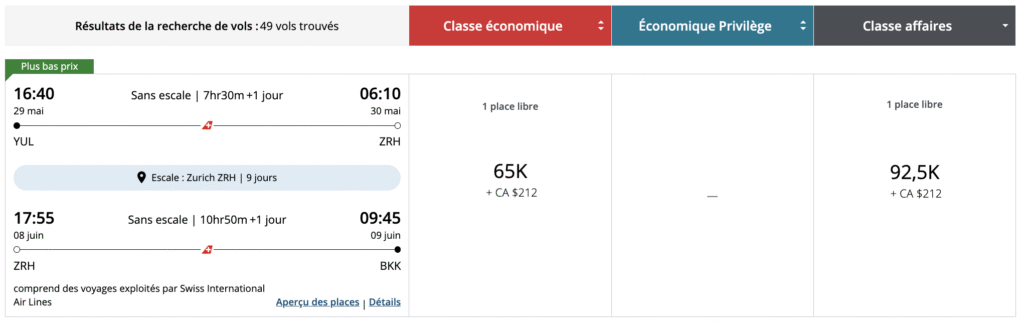 En effet, un vol entre Montréal et Zurich demande 60 000 points en classe affaires. Alors, si vous désirez visiter la Suisse (ou bien une autre destination en Europe) en plus de visiter l’Asie du Sud Est, combiner ces deux voyages est optimal pour votre portefeuille (de points).