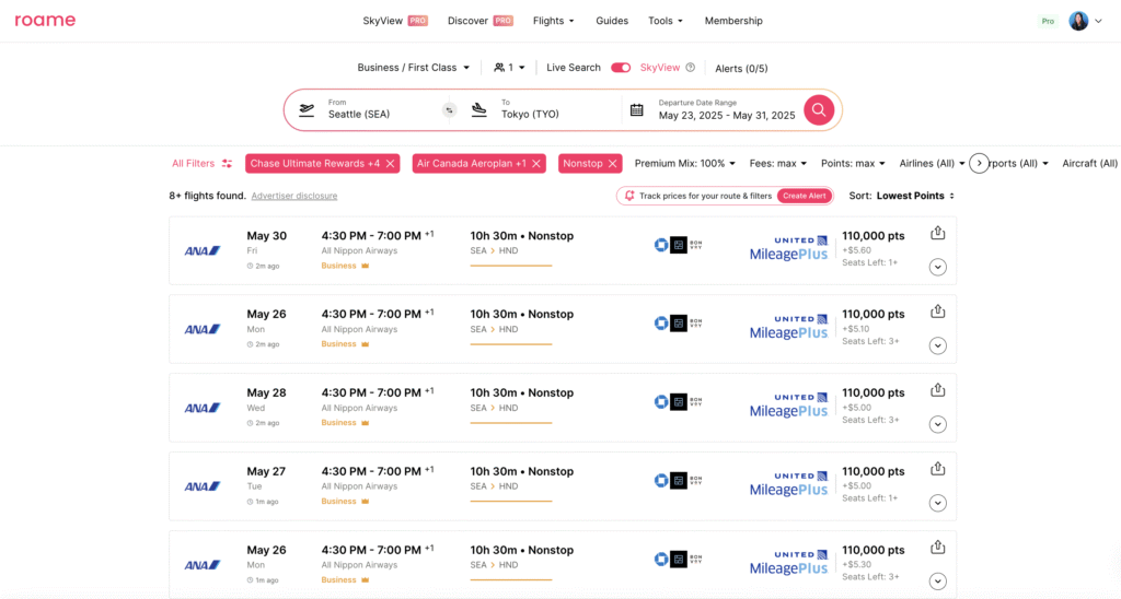 Roame est une plateforme de recherche de disponibilités de billets primes qui permet d’identifier en un coup d’œil les sièges offerts par plusieurs programmes de fidélité, notamment ceux des transporteurs membres de Star Alliance. Même si vous réservez via Aéroplan, Roame est particulièrement utile pour repérer les vols disponibles à la fois sur Aéroplan et sur United MileagePlus, dont les inventaires sont souvent synchronisés.