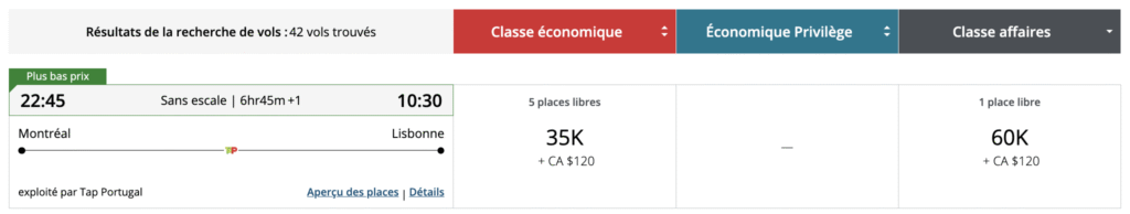 Grâce à la tarification dynamique, il est possible de réserver un vol en classe affaires à partir de 15 000 points Aéroplan en aller simple sur des routes comme Montréal-Toronto, mais ça ne vaut pas tant la peine vu la courte distance.
