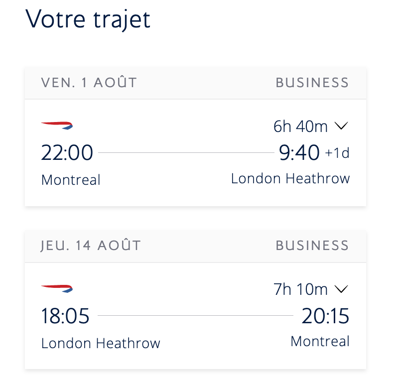 Une autre façon de maximiser votre bon pour compagnon de British Airways est de l’utiliser pour des vols plus longs ou plus chers. Par exemple, vous pouvez utiliser le bon pour compagnon pour un vol aller-retour en classe affaires de niveau « Saver » entre Montréal et Londres. Vous obtiendriez ainsi deux sièges en classe affaires pour 180 000 Avios et 1 500 $ de taxes et de frais, ce qui vous permettrait d’économiser 180 000 Avios !