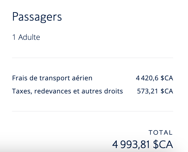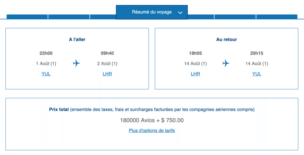 Si vous n’êtes pas admissible pour un vol prime Reward Flight Saver, ou s’il n’y en a pas de disponible, vous verrez à la place des vols prime standards qui facturent l’intégralité des taxes, des frais et des charges. À titre d’exemple de ce que ces frais pourraient vous coûter, les petits caractères de RBC indiquent que cela pourrait représenter environ 870 $ pour un voyage aller-retour de Vancouver à Londres en classe économique. Ce montant est à comparer aux 300 $ de frais exigés si vous avez droit au tarif Saver des vols de récompense (voir ci-dessous).