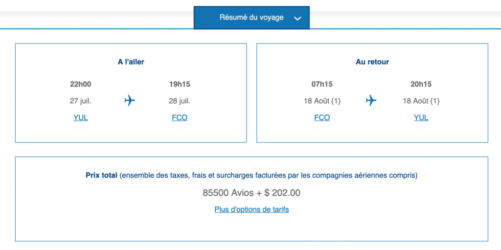 Le nombre d’Avios nécessaires et le coût des taxes et des frais pour ces vols de correspondance dépendront de votre destination finale, mais comme vous pouvez le voir sur les images ci-dessous, la différence de prix peut ne pas être trop importante. La différence pour un vol aller-retour entre Montréal et Londres et un vol aller-retour entre Montréal et Rome (via Londres) n’est que de 25 500 Avios et 2 $ de taxes et frais.