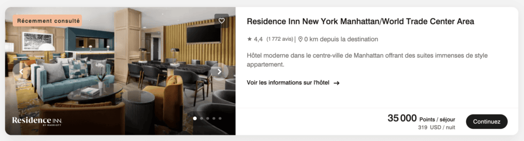 Par exemple, au Residence Inn New York Downtown Manhattan/World Trade Center Area, une nuit d’une valeur de 319 $ US + taxes est disponible pour 35 000 points.