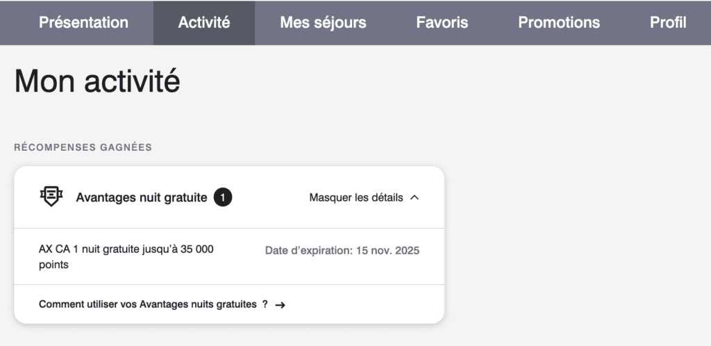 Le certificat d’une nuit gratuite d’une valeur de 35 000 points est valable pendant 12 mois. De plus, le séjour doit avoir lieu avant la date d’expiration du certificat.
