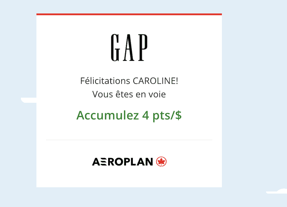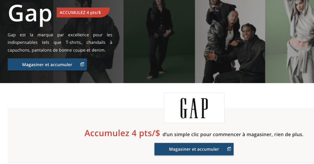 Dans cet exemple, le magasin de vêtements GAP a été sélectionné. On remarque qu’en ce moment, chaque dollar avant taxes dépensé dans cette boutique donnera 3 points Aéroplan. Ceci varie au gré des promotions.