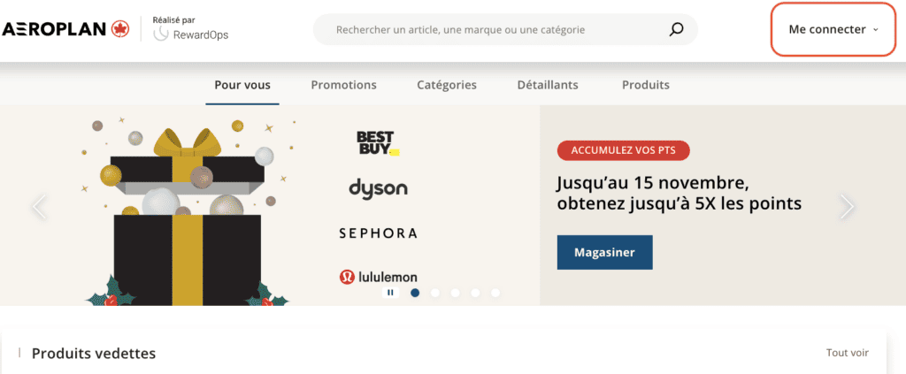 Tout d’abord, allez sur la page de l’eBoutique Aéroplan et connectez-vous à votre profil Aéroplan, en haut à droite. Si vous n’êtes pas membre d’Aéroplan, inscrivez-vous gratuitement.