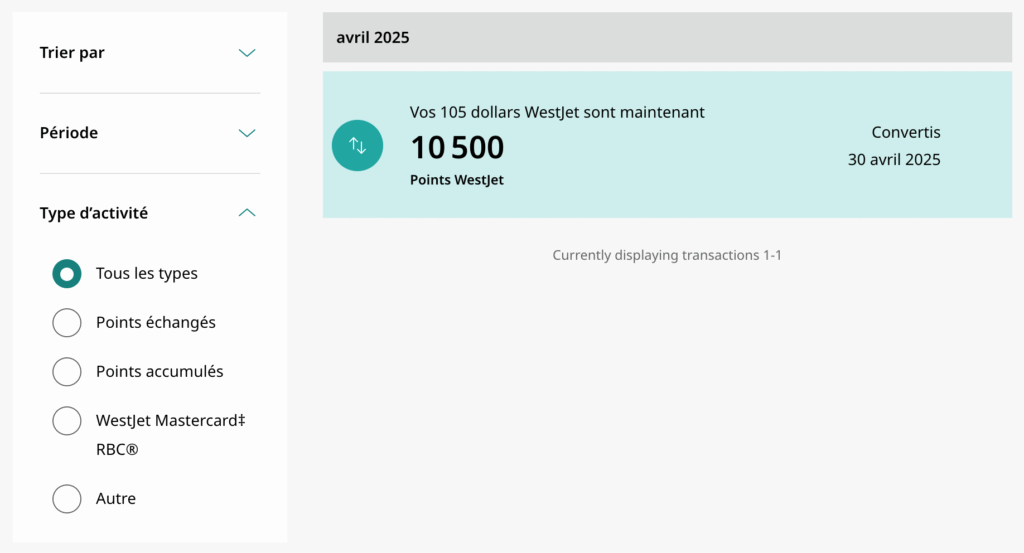 Un point Récompenses WestJet vaut 1 cent.