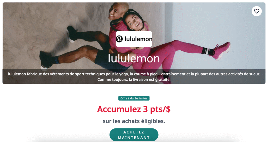 Par exemple, si vous dépensez 200 $ chez Lululemon avec la Carte WestJet® World Elite Mastercard RBC, vous obtiendrez 600 points WestJet par l’entremise de la eBoutique (selon le taux élevé à durée limitée de 3 points/1 $) plus 300 points WestJet avec votre carte de crédit (grâce à son taux de rendement de 1,5 point par 1 $ dépensé pour les achats courants).