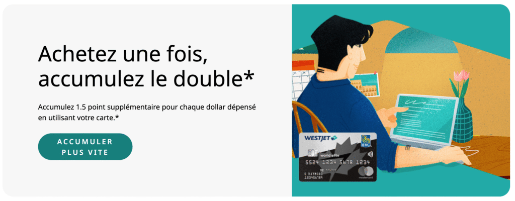 En utilisant la Carte WestJet Mastercard RBC ou la Carte WestJet World Elite Mastercard RBC, vous obtiendrez des points deux fois ! Obtenez-en une fois par le biais du portail d’achat de la eBoutique et une autre fois grâce aux taux d’accumulation de la carte de crédit WestJet.