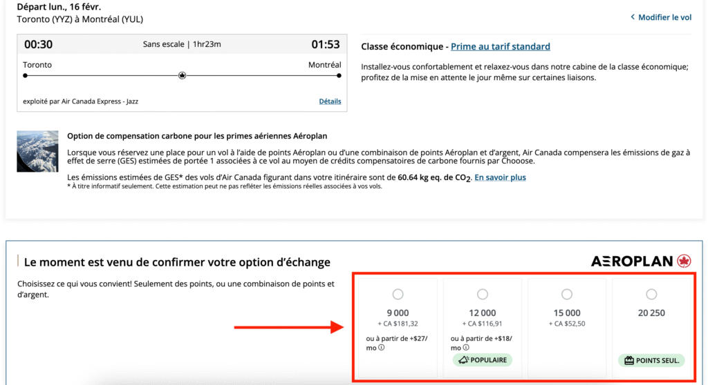 Comme vous pouvez le voir dans l’image ci-dessous, en fonction du montant, vous pouvez choisir de couvrir la partie en argent de vos réservations sur Aéroplan à l’aide de Flex Pay.
