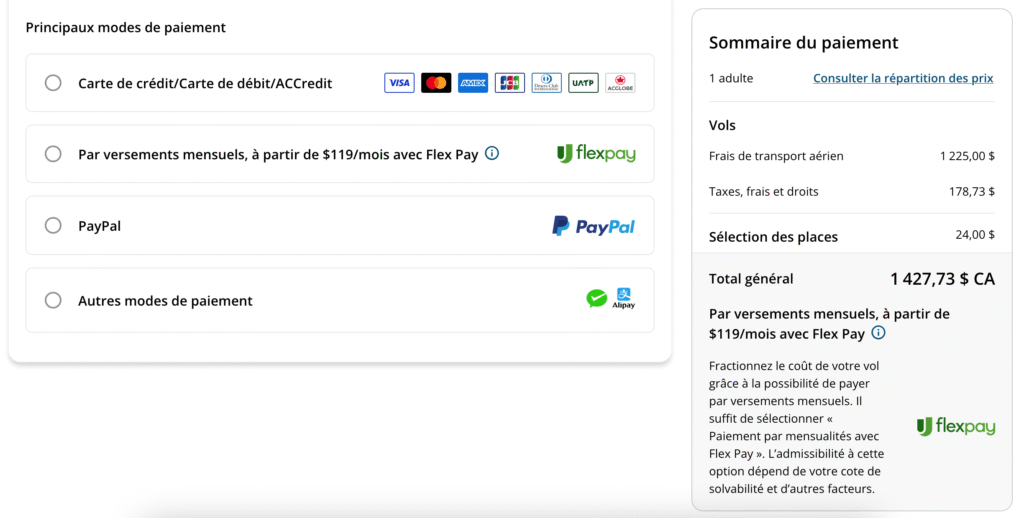 Quelques points supplémentaires à noter lorsque vous envisagez l’option Flex Pay pour Air Canada :