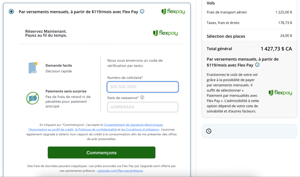 En ce qui concerne la comparaison entre Flex Pay et le simple paiement par carte de crédit, l’avantage principal réside dans la clarté des coûts affichés dès le départ. Si vous mettiez le coût du vol ou des vacances sur une carte de crédit et que vous en reportiez le solde, il serait plus difficile de déterminer les intérêts accumulés exacts, surtout si vous continuez à utiliser la carte en même temps.
