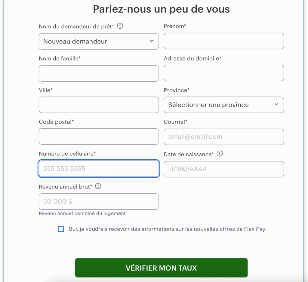 À ce stade, vous devrez saisir quelques informations pour que Flex Pay puisse décider si vous remplissez les conditions requises pour le prêt, avec quel taux d’intérêt et quel calendrier de paiement. Les informations requises comprennent généralement votre nom complet, votre adresse, votre adresse électronique et votre revenu annuel brut.