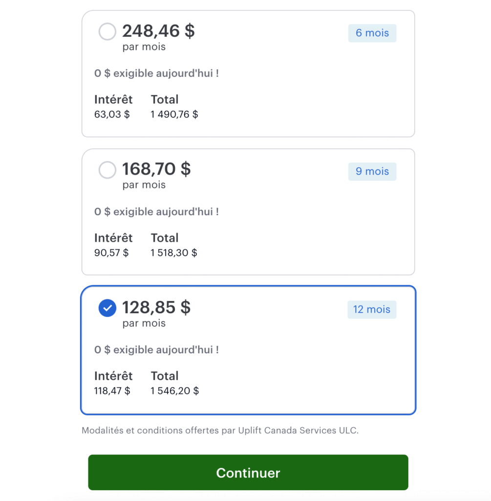 Une fois vos informations saisies, Flex Pay vous indiquera les plans de paiement auxquels vous êtes admissible. Vous pouvez alors choisir celui que vous préférez et finaliser votre achat.