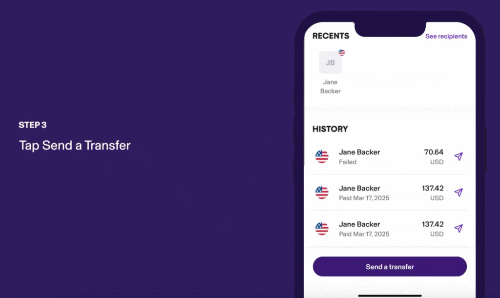 Une fois que votre compte est approvisionné, vous pouvez sélectionner « Envoyer », puis « Envoyer à l’international » sur le site web ou dans l’application.