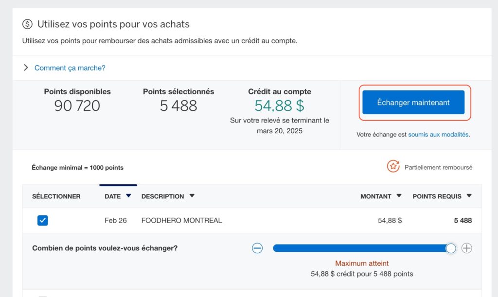 Vous pourrez bouger la réglette au point près, le nombre de points-privilèges que vous souhaitez utiliser pour cette transaction. Ici, je choisis 5 488 points privilèges pour un crédit de 54,88 $.