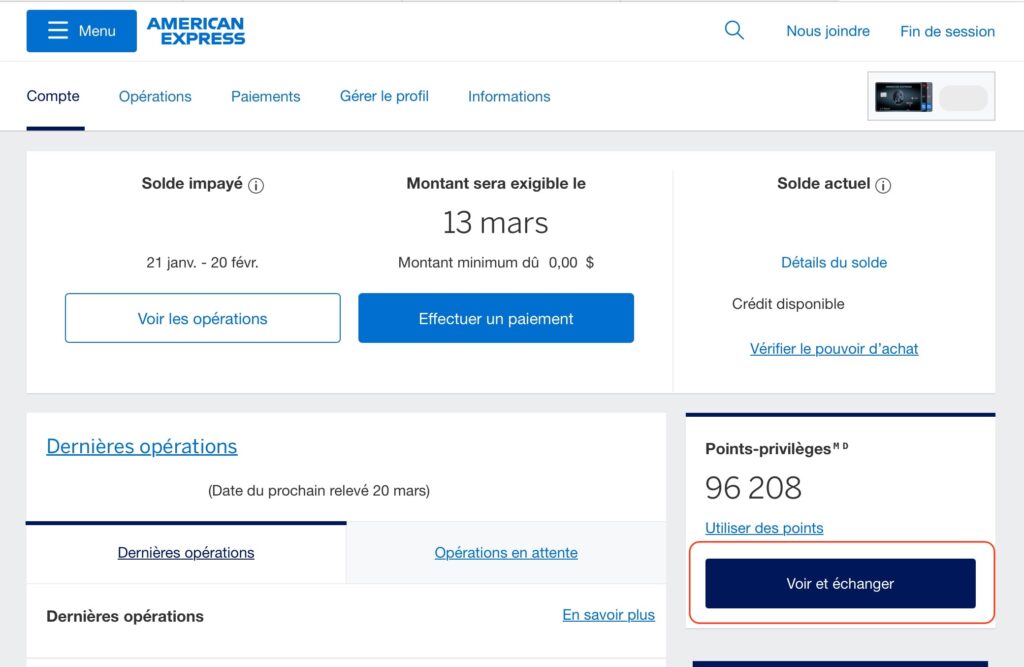 Ici, l’exemple est pour une Carte CobaltMD American Express, mais la procédure est la même pour les cartes avec Points-Privilèges d’American Express.
