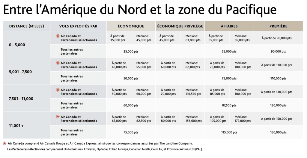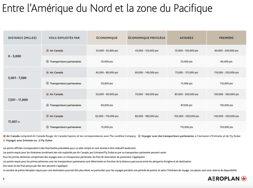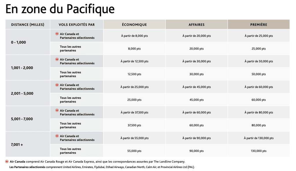 Voici la grille tarifaire d’Aéroplan pour des voyages dans la zone Pacifique: