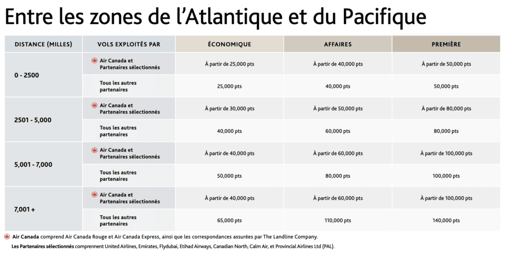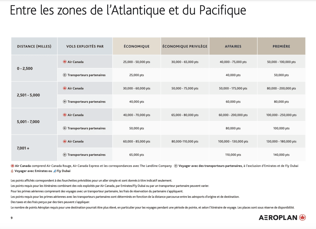 Voici la grille tarifaire d’Aéroplan pour des voyages entre la zone Atlantique et la zone Pacifique:
