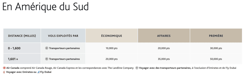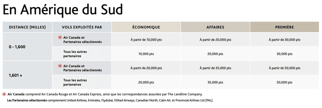 Voici la grille tarifaire d’Aéroplan pour des voyages dans la zone Amérique du Sud: