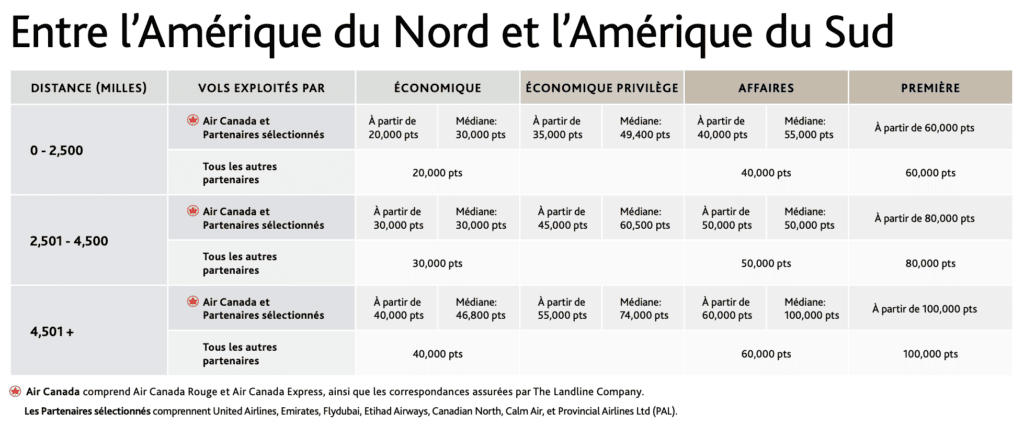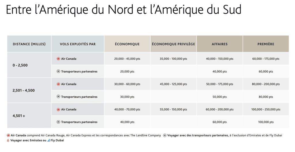 Voici la grille tarifaire d’Aéroplan pour des voyages entre la zone Amérique du Nord et la zone Amérique du Sud: