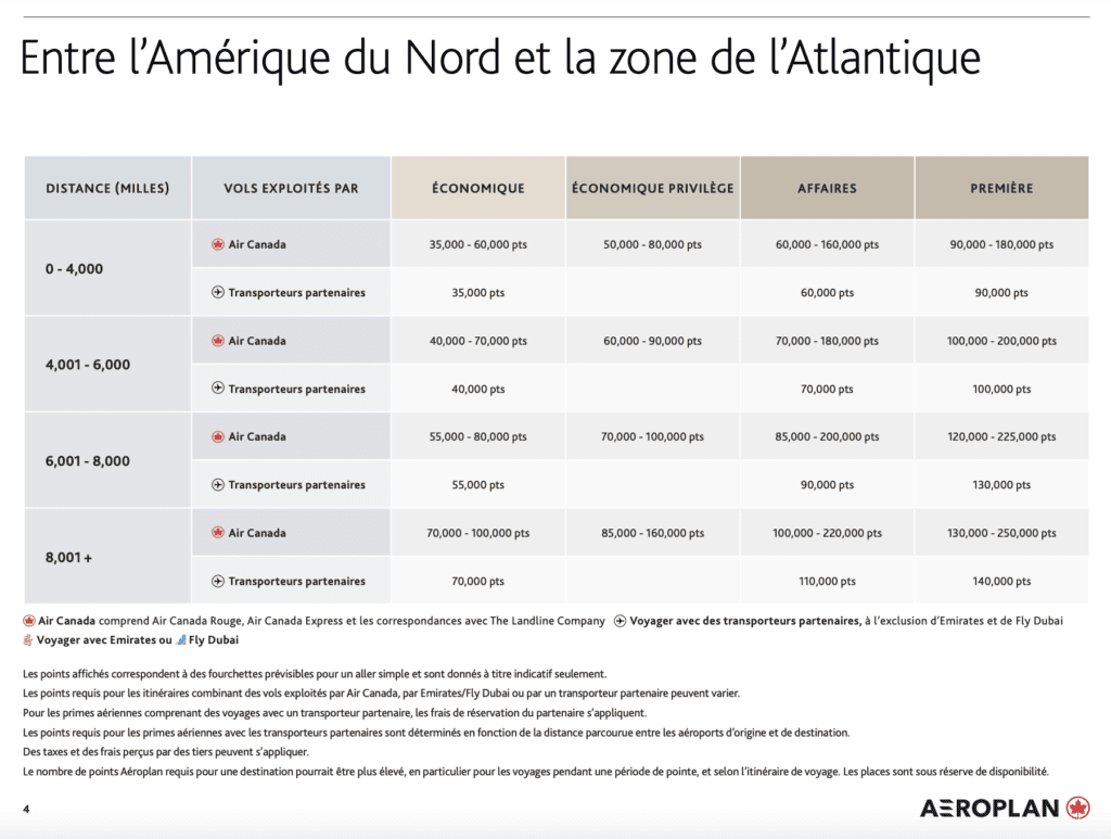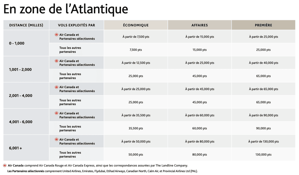 Voici la grille tarifaire d’Aéroplan pour des voyages dans la zone Atlantique:
