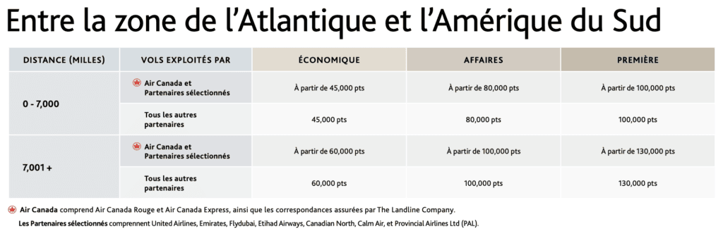 Voici la grille tarifaire d’Aéroplan pour des voyages entre la zone Atlantique et la zone Amérique du Sud: