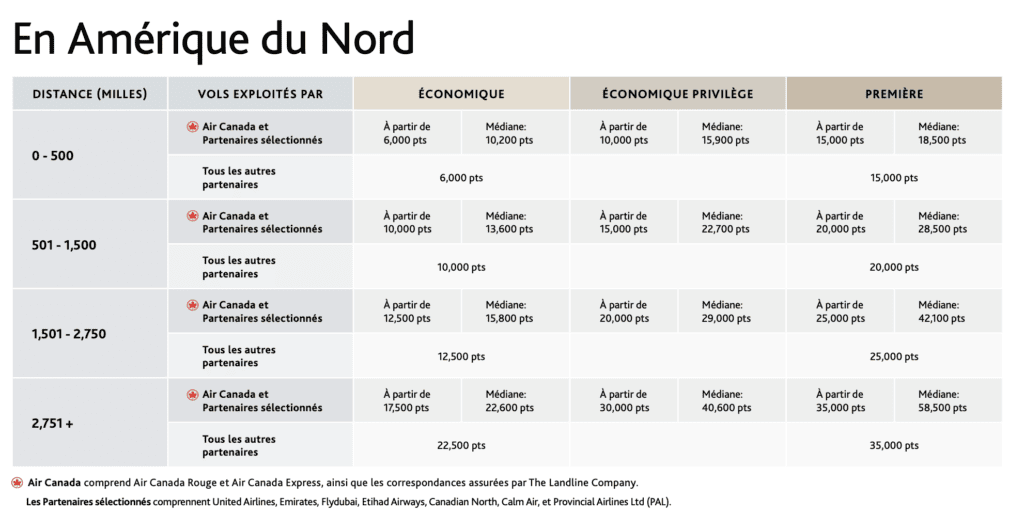 Voici la grille tarifaire d’Aéroplan pour des voyages dans la zone Amérique du Nord: