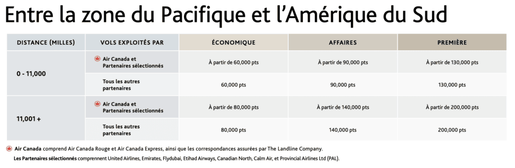 Voici la grille tarifaire d’Aéroplan pour des voyages entre la zone Pacifique et la zone Amérique du Sud: