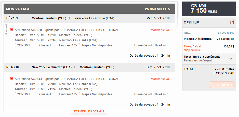 American Express Voyages propose ce même aller-retour sur Air Canada à 36 097 points et 148,44 $ avec l’option de voyage à points souples: