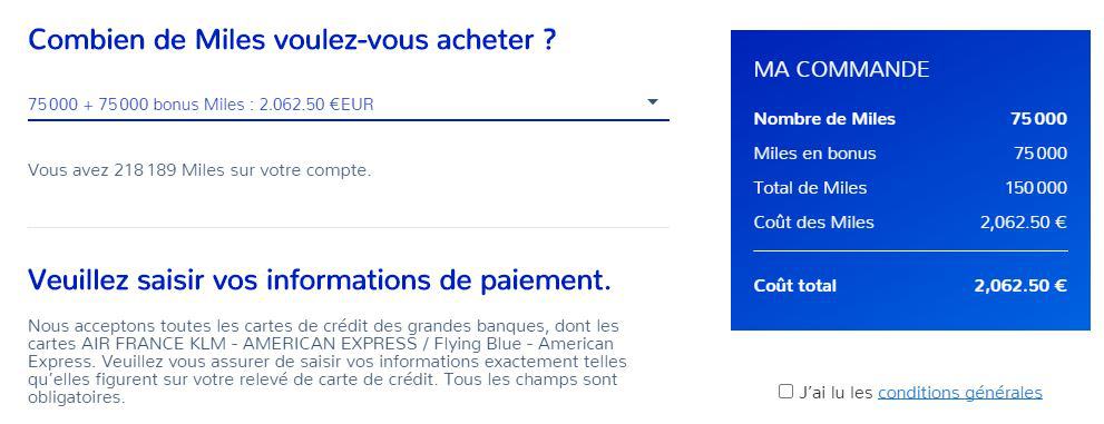 Vous pouvez acheter des Miles Flying Blue par tranche de 2 000, entre 2 000 et 100 000 Miles Flying Blue. Lorsqu’il n’y a pas de promotion, la valeur d’un Mile est équivalente à 3 cents USD.
